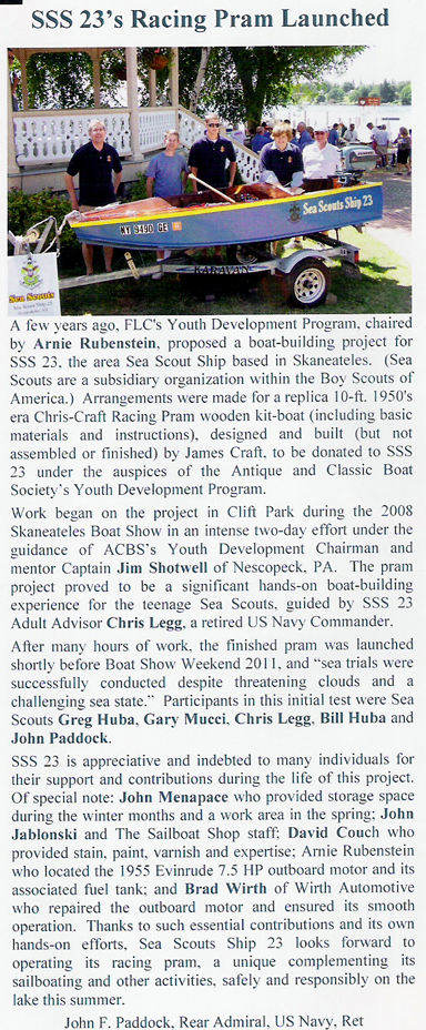 The Sea Scouts are an arm of the Boy Scouts of America, and Sea Scouts Ship 23 is part of the Hiawatha Seaway Council, BSA (headquartered in Syracuse) which is a 501(c)3 organization. Thanks. Arnie Rubenstein, Director Finger Lakes Chapter, ACBS