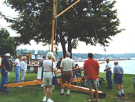 THE LAWN DISPLAYS ARE AN IMPORTANT PART OF OUR CHAPTER'S SHOW. HERE'S A PICTURE OF A GROUP ENJOYING AND DISCUSSING AN UNUSUAL ICE BOAT...
